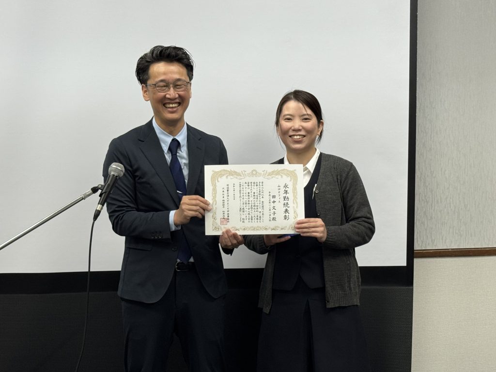 また、10年以上弊所を支えてくれた社員の永年勤続表彰も行いました。長年事務所を支えてくれた仲間の功績を称え、会場は温かな拍手に包まれました。
