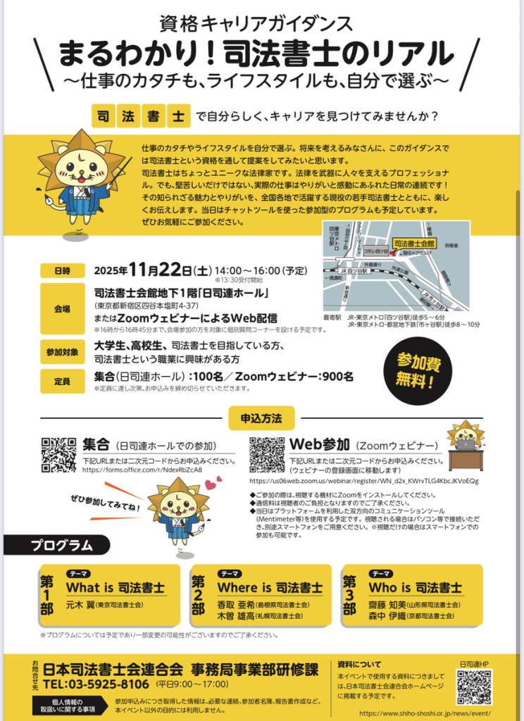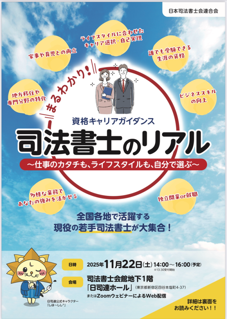 2つ目にご紹介するのは、11月22日にありました、日本司法書士会連合会主催の「資格キャリアガイダンス 司法書士のリアル」です。